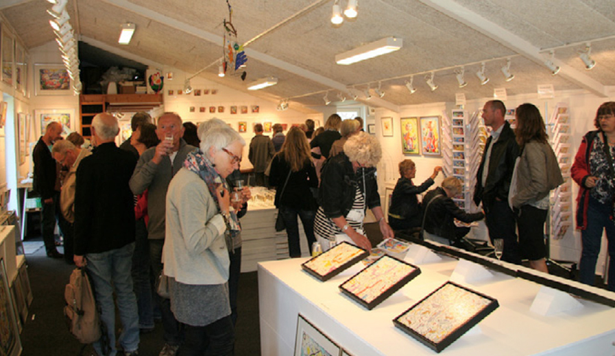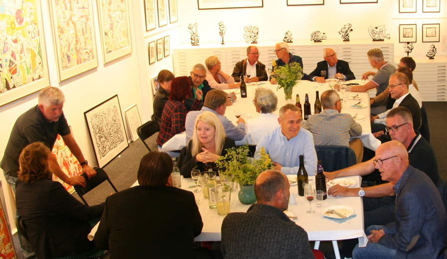 Kunst, Kaffe & Kage i Galleri Jes Nordby Indhold Vi vil gerne byde foreninger, virksomheder og andre grupper velkommen til “Kunst, Kaffe & Kage" i Galleri Jes Nordby, beliggende på den naturskønne Stenderup Halvø nær Kolding. Her får I både et indblik i multikunstner Jes Nordbys virke, kaffe/te & lagkage og tid til samvær med venner, familie eller kollegaer i hyggelige og inspirerende omgivelser. Forløb I mødes i Galleri Jes Nordby, hvor Jes fortæller om sin kunst og sit arbejde (ca. 1 time). Herefter bliver I budt på kaffe/te & lagkage. Når I er klar, kan I gå på opdagelse i galleriet eller strække ben i vores have. Varighed ialt: ca. 2,5 timer. Mulighed for at slutte af med tapas menu i Bjert Gamle Brugs. Pris Pris pr. person: 180 kr. (ekskl. tapasmenu). Deltagerantal 12 - 50 personer. Tilmelding Dato og tidspunkt ifølge aftale. Kontakt Galleri Jes Nordby på tlf.: 5289 8590 eller mail: info@jesnordby.com Adresse til Galleri Jes Nordby Galleri Jes Nordby Stenderupvej 125 6092 Sønder Stenderup Tel.: +45 5289 8590 Mail: info@jesnordby.com Se rutevejledning her: Vejviser Referencer Tour de Kultur, Jylland Y´s Men´s Club, Lunderskov Tirsdagsklubben, Sdr. Stenderup Rotary, Fredericia CUBUS, Vissenbjerg Lions Club, Bramdrupdam Seniorklubben Vejle, Vejle Seniorklubben Dreyershus, Kolding XT16-Round table, Kolding Ribe Kunstforening, Ribe Lisbeth & venner, Kolding Kratluskerne, Kolding Klub 2000, Rødding Malerpigerne, Vejle De5, Hammel-Uglerne, Jylland Børne- og uddannelsesforvaltningen, Kolding Schneider Electric, Netværksgrupper, Kolding Koldingfjord Rotaryklub, Kolding Y´s Men´s Club, Kolding Dorothea, Erhvervsnetværk, Kolding Senior Chambers, Kolding Vestfyns Husflid, Middelfart Skt. Knudsgades Syklub, Odense Vojens Kunstcirkel, Vojens Sel(v)skabsklubben, Christiansfeld Hjerteforeningen, Kolding Kunstcirklen Soluret, Nyborg HK Company Art, Kolding Hansenberg pensionistforening, Kolding Lægehuset Bjert, Bjert UU-vejlederne, Kolding Børne- og skoleforvaltningen, Kolding Lunderskovpigerne, vandreklub, Lunderskov VELUX A/S, production team, Kolding/København Grønne pigespejdere, ledergruppe, Kolding Dybøl Efterskoles bestyrelse, Dybøl Midtfyns Vandforsyning, Ringe Simmersteds Husholdningsforening, Simmersted Krisecenter Sønderjylland, Sønderborg Kunstforeningen PAKHUSET, Faaborg Litteraturklubben, Vejen Inner Wheel, Assens Sydbank seniorklub, Kolding og omegn Kvindeklubben, Vamdrup FOF, Daghøjskolen, Kolding Klub 92, Vamdrup PET, Kolding Horsens Gymnasium, "Efter Skoletid", Horsens By- og Udviklingsforvaltningen, Kolding Kusineklubben, Kolding Kunstgruppen, Vejle Kirsebærhaven, personalegruppe, Kolding Hønsesklubben, Kolding Torsdagsklubben, Harte Pensionistforeningen, Bjert FOF, undervisere, Kolding Daginstitutionen Kernehuset, Nr. Bjert KHL, Kolding Odense Renovations Kunstforening Naboklubben, Tved Børne- og uddannelsesforvaltningen, personalegruppe, Kolding Inner Wheel, Vamdrup Ærø Kunstforening Social- og sunhedsforvaltningen, personalegruppe, Middelfart Inner Wheel, Christiansfeld Kolding Husflidsforening, Kolding Skovagerskolens Kunstforening, Jelling Bofællesskabet Gyndbjerg, Bjert BUPL senior, Haderslev Støttecentret for senhjerneskadede, personalegruppe, Kolding Club 19, DK Guldpigerne, DK Jobcenter Vejen Klub Primo, Haderslev Kvarterhusets Malergruppe, Kolding Designbørnehuset, personalegruppe, Vonsild Bureau Veritas, Fredericia Oasen, Vester Nebel Odd Fellow logen, Kolding Kolding Lærerkreds 1 Kolding Lærerkreds 2 Odense Universitetshospitals Kunstforening Kolding Kunstkompost Vejle Sekretærforening Bjert/Stenderup Husholdingsforening Vejen Soroptimistklub Dong Energys Kunstforening, Fredericia Campus Vejles Kunstforening Inner Wheel, Middelfart Den Kommunale Tandpleje, Vejen Diverse private grupper Udtalelser Mandag aften den 8. maj besøgte Lions Bramdrupdam Galleri Jes Nordby i Sdr. Stenderup. Det lykkedes at samle 24 løver og løvinder til foredrag og lækkert kaffebord. Jes holdt et spændende og særdeles fængende foredrag med farverigt power point til at visualisere hans fortællinger, som strakte sig fra hans barndom, og op til hvor han er i dag. Han voksede op i Fovslet på en gård, som i alle lokaler var spækket med malerier fra forskellige kunstnere bl. a. Heerup. Hans forældre havde tæft for kunst. Det er utroligt hvad en streg, som for enden er en prik kan blive til. Det formåede Jes at føre os ind i den forunderlige verden, hvor han ved hjælp af små billeder kunne få os til at se nogle elementer, som ved forstørrelser blev til flere selvstændige figurer, det var meget fascinerende. Efter foredraget blev der serveret kaffe/te juice og vand, hertil de lækreste hjemmelavede flødeskumslagkager og andre søde sager. Til slut fik løverne lov til at holde en kort ekstraordinær generalforsamling. Løvinderne kom ind og så Jes Nordbys værksted, det var en rigtig positiv rundvisning, som gav et godt indblik i kunstnerens hverdag. Vi fra Lions Bramdrupdam takker Jes for en fantastisk oplevelse udover det sædvanlige. (Teddy Schønberg, Vicepræsident Lions Club, Bramdrupdam)