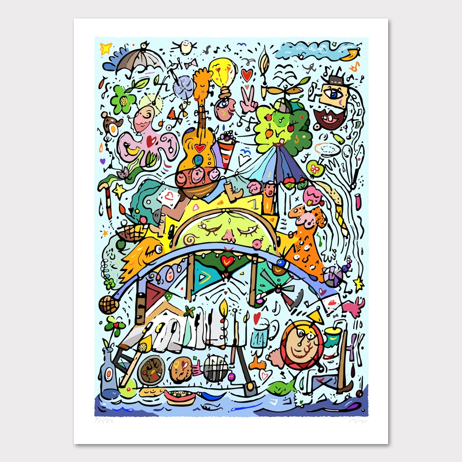 Den første spæde skitse til billedet tegnede Jes sidste år i Sønder Bjert under Blue Bridge Festivalen, og hele overskuddet fra salget går til at kunne støtte op om festivalens mange musikalske og menneskesamlende initiativer.
