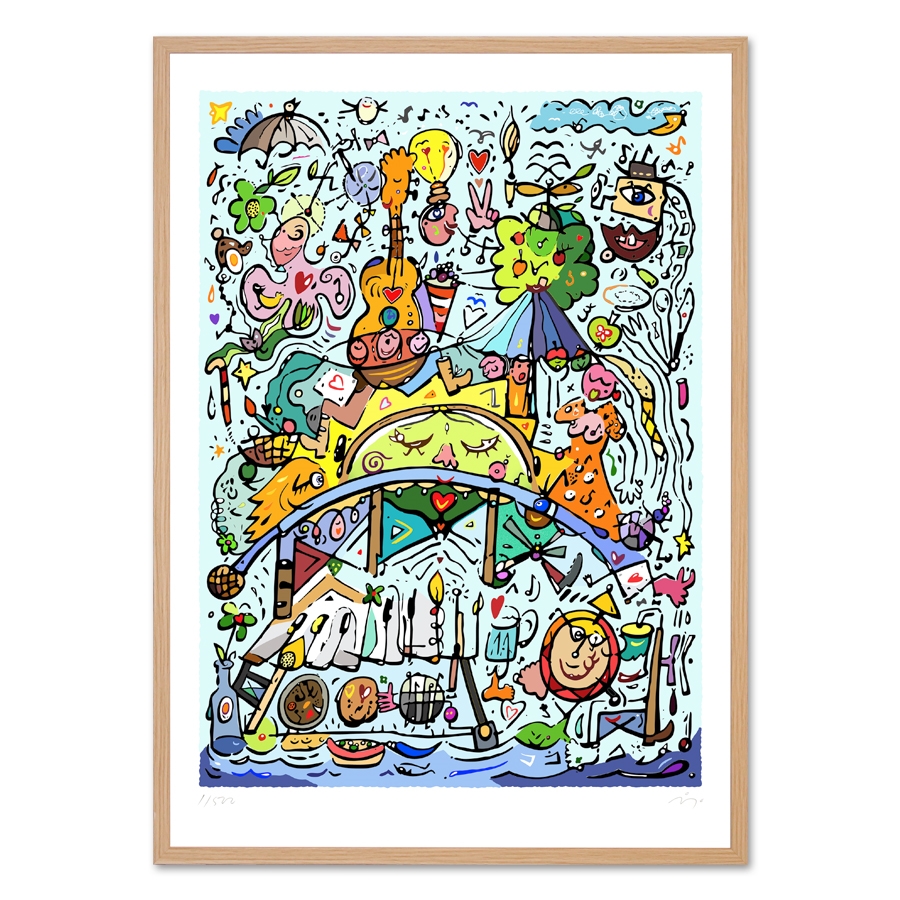 Den første spæde skitse til billedet tegnede Jes sidste år i Sønder Bjert under Blue Bridge Festivalen, og hele overskuddet fra salget går til at kunne støtte op om festivalens mange musikalske og menneskesamlende initiativer.